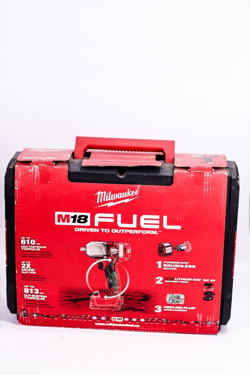 دريل فك وربط 1/2 بوصة بطارية بدون شربون مضاد للصدمات والغبار مقبض مريح أضائة LED عزم الربط من 610 نيوتن حتي 813 نيوتن عدد 2 بطارية ليثيوم 18 فولت 4 أمبير والشاحن العلامة التجارية milwaukee. مثالي لأعمال الفك والربط الشاقة.