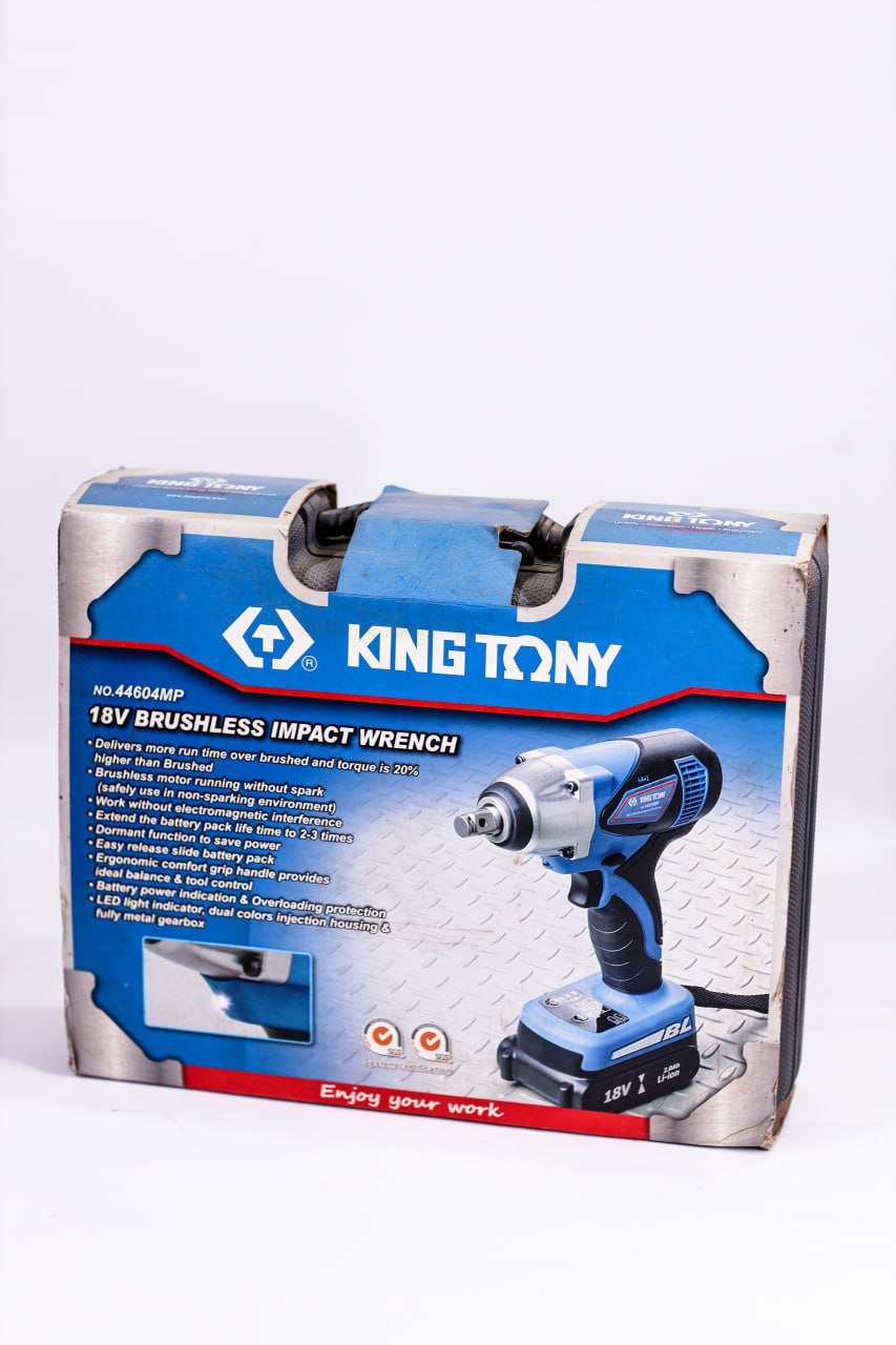 دريل فك وربط من KING TONY تايواني الصنع، يعمل ببطارية ليثيوم أيون 18 فولت 2.0 أمبير، مزود ببطاريتين وشاحن. يتميز بتصميم مضاد للصدمات والغبار، أداء قوي، وسرعة عالية للفك والربط في الاستخدامات المهنية والورش الصناعية.